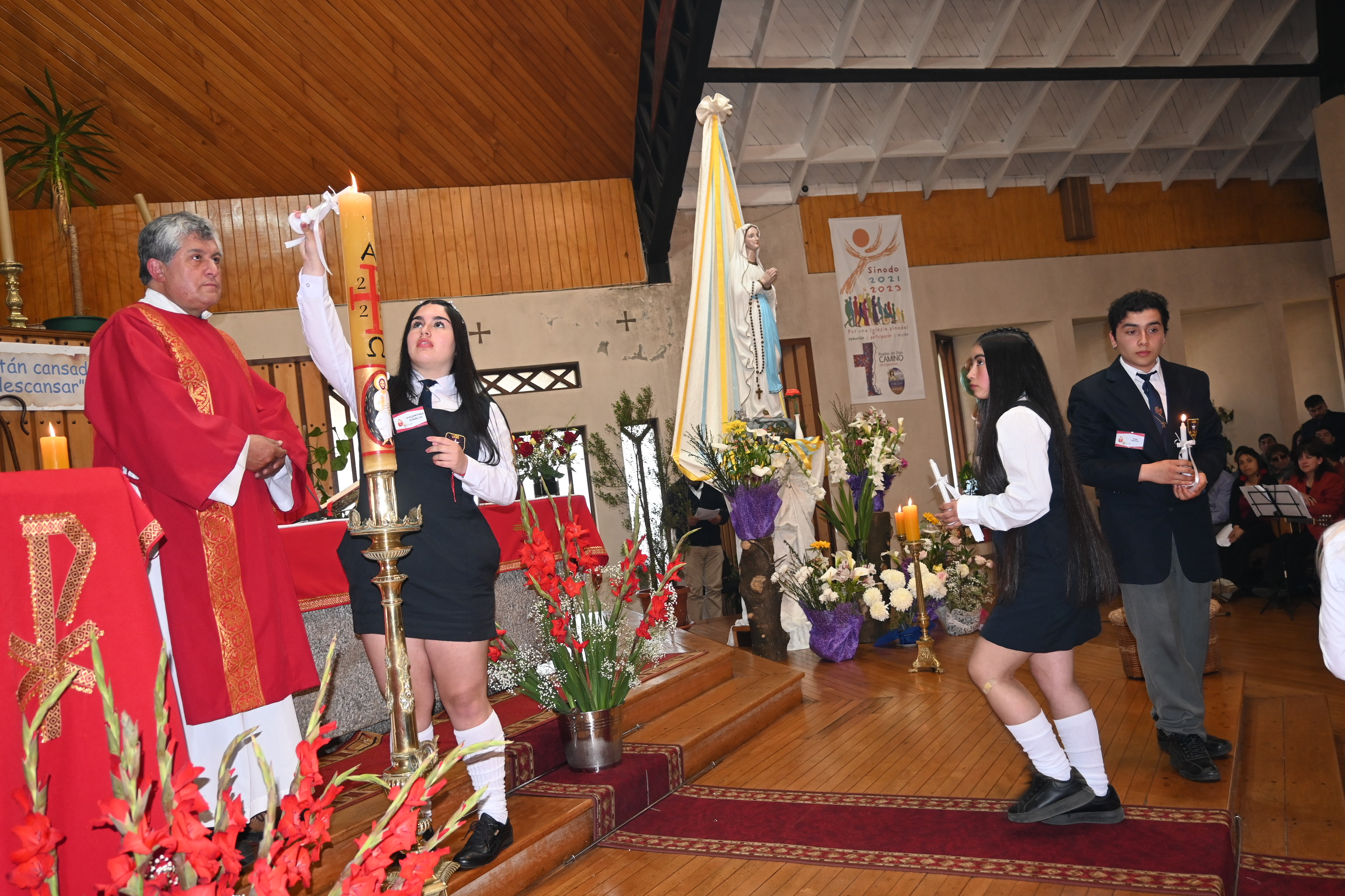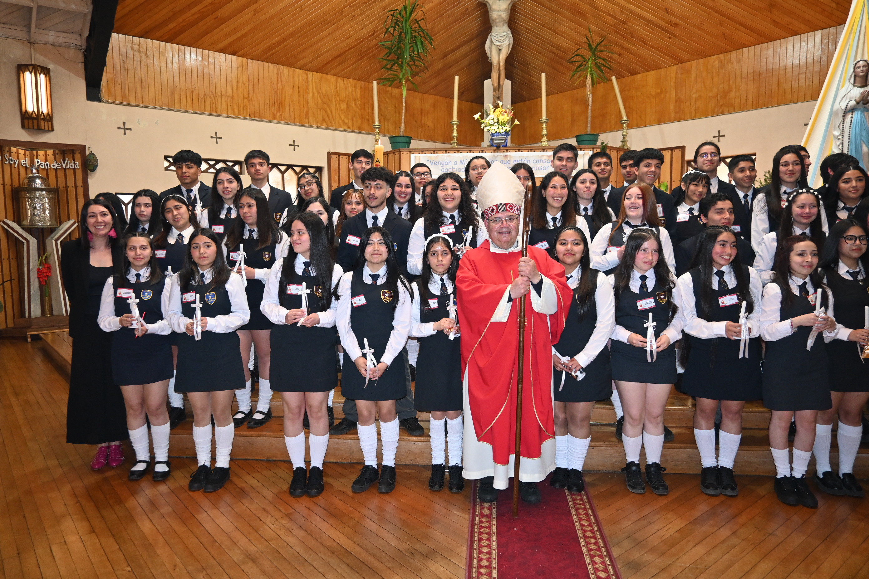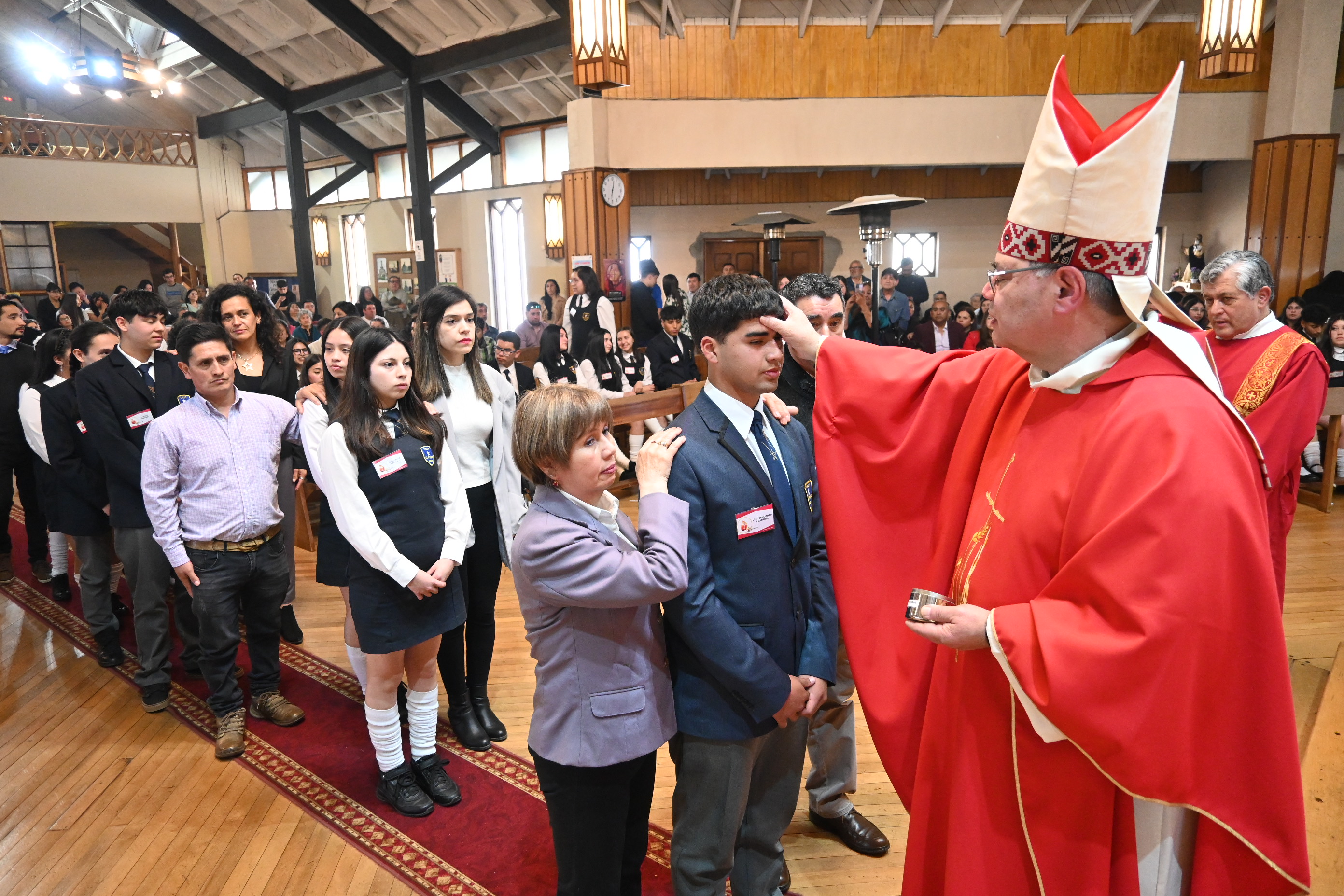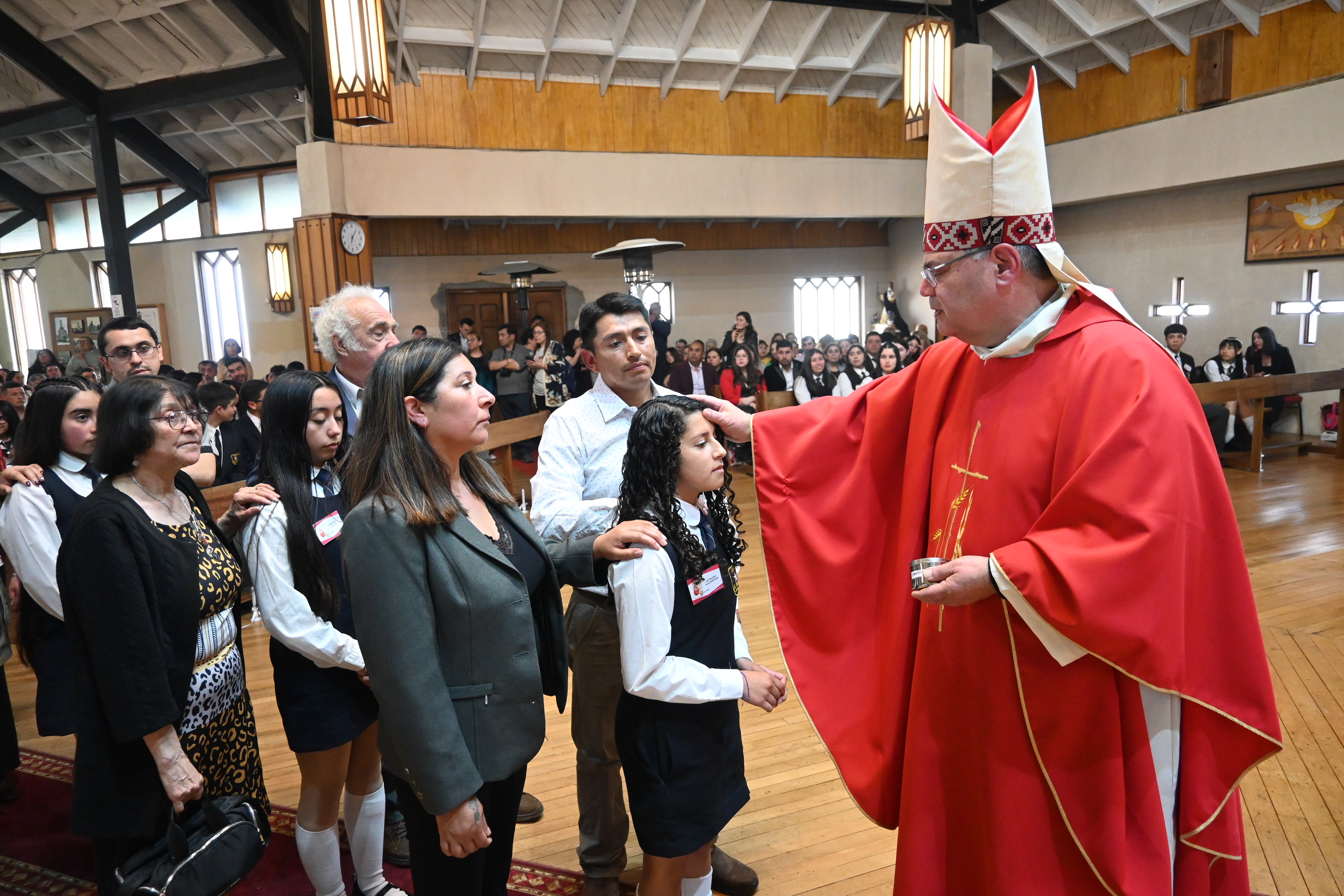 El acto religioso estuvo encabezado por el obispo de la Diócesis San Carlos de Ancud, monseñor Juan María Agurto, quien procedió a uncir con los santos óleos a las y los jóvenes que recibieron el sagrado sacramento, el cual simboliza hacer su fe y continuar integrándose de forma plena como miembros de la comunidad católica.