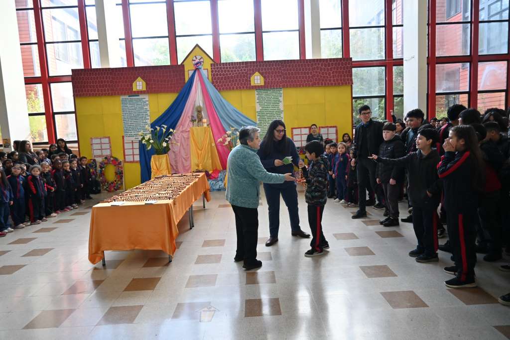 Hoy por ejemplo, en dependencias del Colegio El Pilar, se congregó a primera hora de la mañana a toda la comunidad educativa para cantar y elevar oraciones a nuestra Madre. De igual manera cada curso, desde Pre Kinder a Octavo Básico, recibió de manos del Equipo de Formación Pastoral un rosario de madera para que pueda ser colocado en su sala de clases.