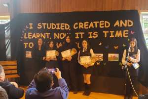 A 2° medio le tocó levantar una muestra de trabajos seleccionados hecha en clases, que abordó la temática del cuidado y preocupación por el planeta “SAVING THE PLANET”.