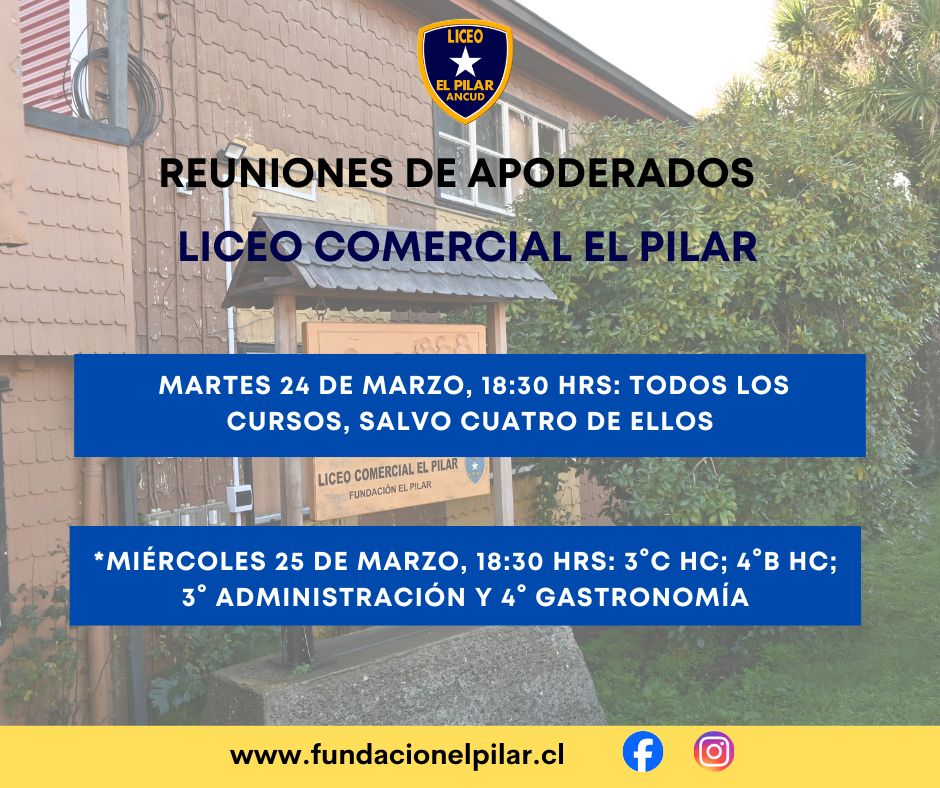 El Liceo Comercial El Pilar informa a los padres y apoderados que la primera reunión de apoderados correspondiente al mes de marzo se realizará de acuerdo al siguiente cronograma: