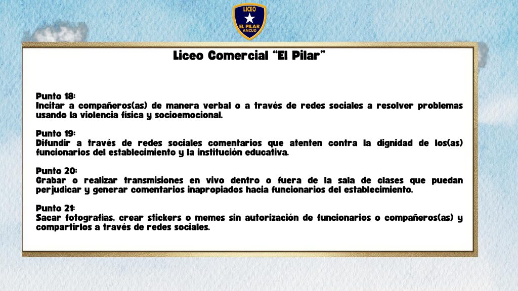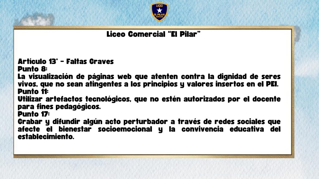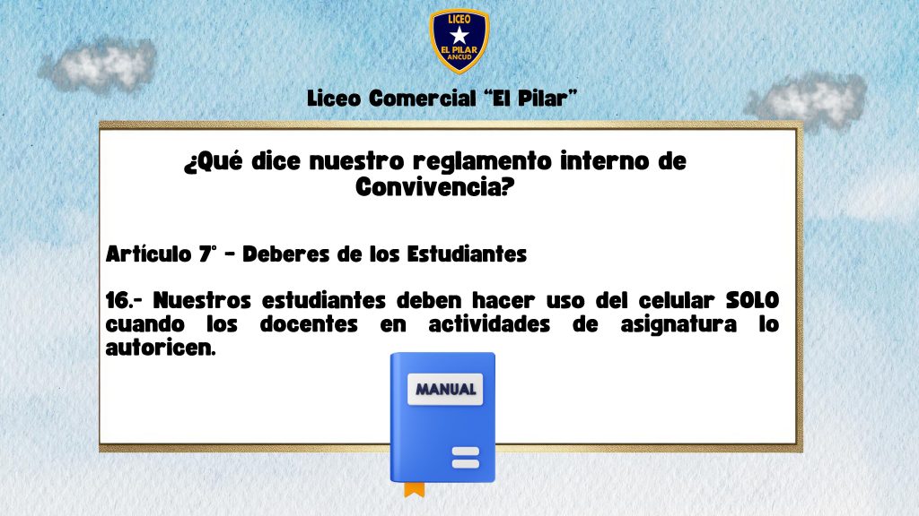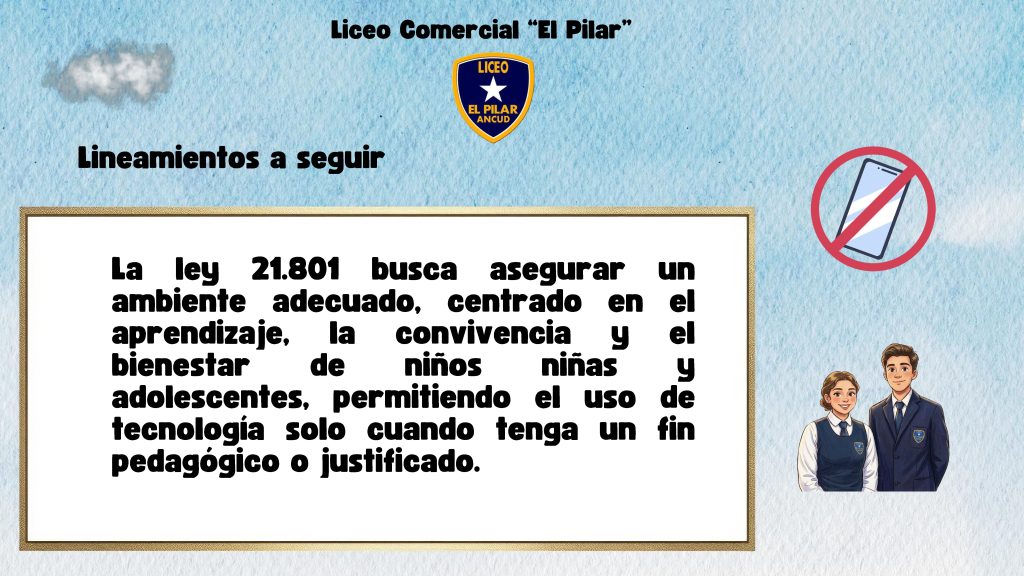 Mañana inicia el Año Escolar 2026 para cientos de alumnos y alumnas de nuestro Liceo Comercial El Pilar. Por esta razón compartimos unas láminas que hablan respecto al uso de dispositivos móviles en el Establecimiento.
